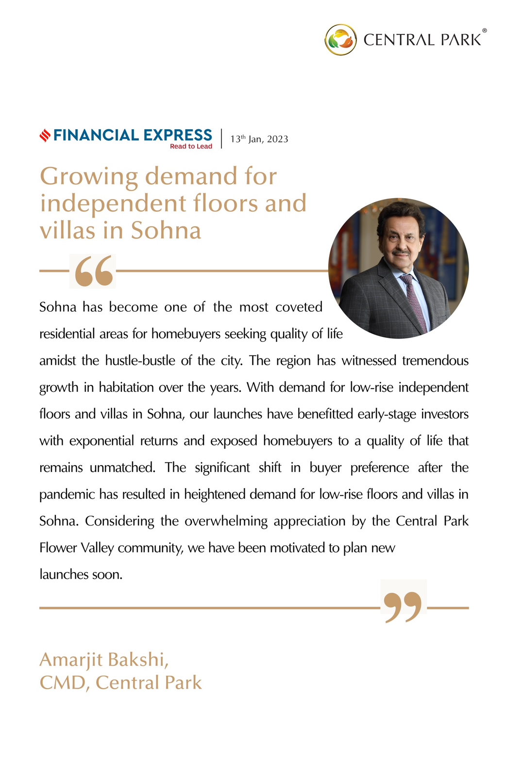 Sohna has become one of the most coveted residential areas for Homebuyers seeking quality of Life amidst the hustle bustle of the city. The region has witnessed tremendous growth in habitation over the years. With Demand for Low Rise Independent Floors & Villas in Sohna, our launches have benefitted early stage Investors with Exponential Returns and exposed Homebuyers to a Quality of Life that remain Unmatched. The significant shift in Buyer preference after the pandemic has resulted in heightened demand for Low Rise Floors & Villas in Sohna. Considering the overwhelming appreciation by the Central Park Flower Valley community, we have been motivated to Plan New Launches Soon.
